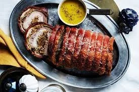 Rolled pork belly stuffed with apple, fennel + pistachio